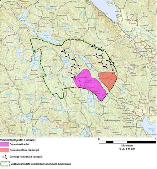 I området Finnfallet i sydöstra delen av Sunne kommun finns idag 16 vindkraftverk som förvaltas av oss. Vi utreder nu möjligheterna att bygga ytterligare vindkraftverk söder om de befintliga vindkraftverken. Området ligger cirka 4,5 kilometer sydväst om Rottneros tätort.